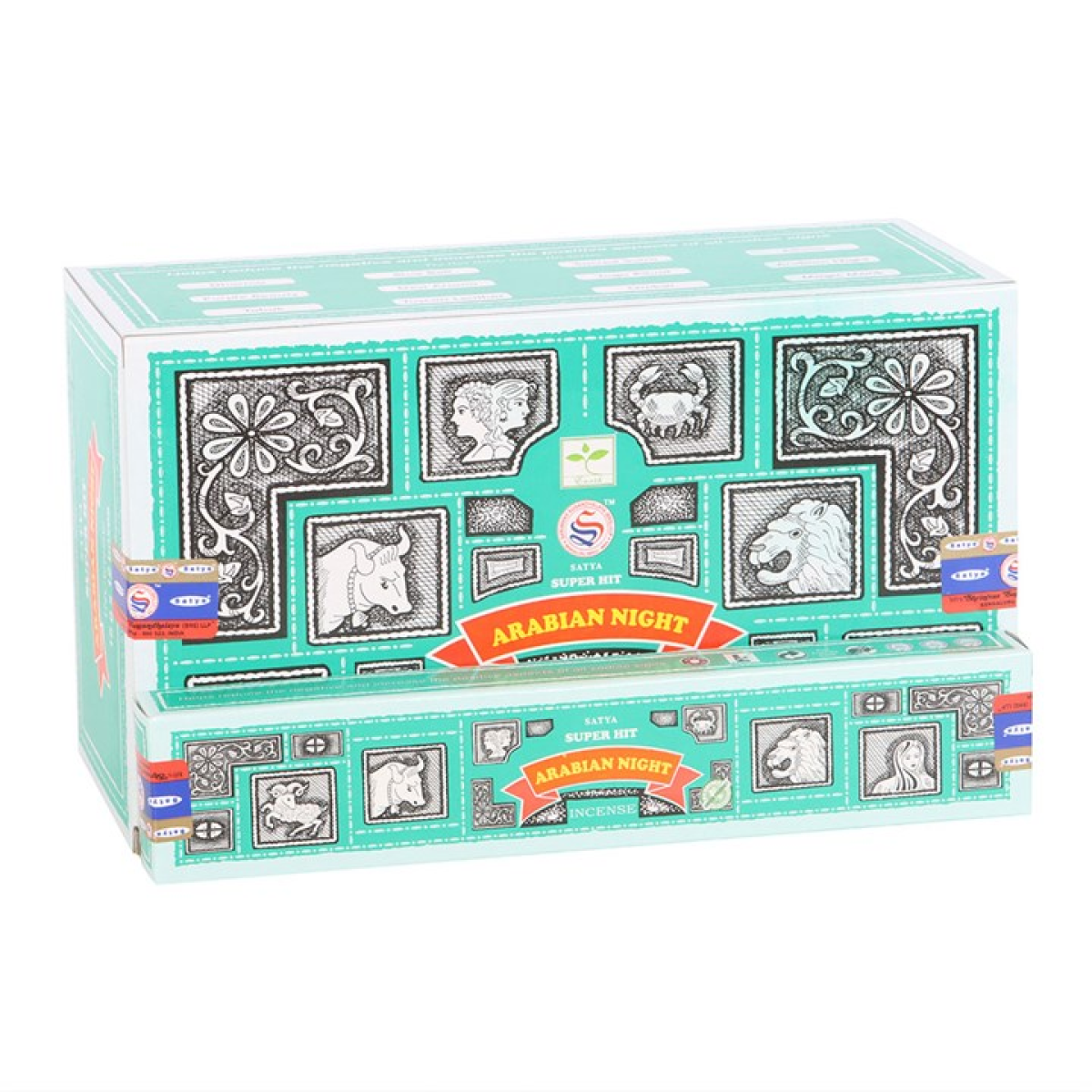 Stock up on the bestselling Satya brand with this box of incense sticks, featuring 12 packs of Superhit Arabian Nights incense. Rich in deep, spicy, and woody notes, it’s reminiscent of the mystery and romance of an Arabian night, creating a rich and aromatic atmosphere. Sold as a display of 12 packs. Vegan and cruelty-free.