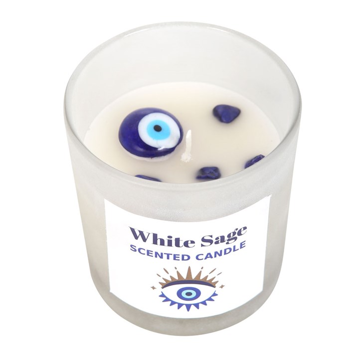 Ward off negative energies and protect against harm with this stunning White Sage fragranced candle. A frosted glass holder is accented by a scattering of sodalite crystal chips and a glass All Seeing Eye charm that can later be reused for a multitude of spiritual purposes. Paraffin wax. Crystals and charm will release from wax with use. Approximate burn time of 25 hours. Please practice caution when burning and never leave lit candle unattended.