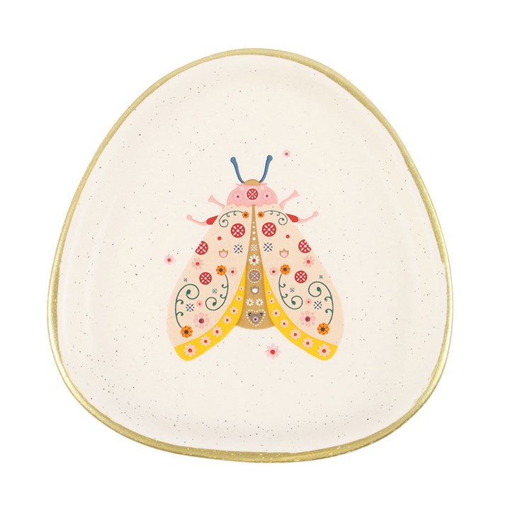 Keep your treasures safe with this sweet and cheerful trinket dish. Crafted in an organic shape with a playful floral moth design, speckled ceramic finish and gold edging, it makes a whimsical and functional addition to your decor. Perfect for holding jewellery, keys, or other small keepsakes on a desk, table or vanity.