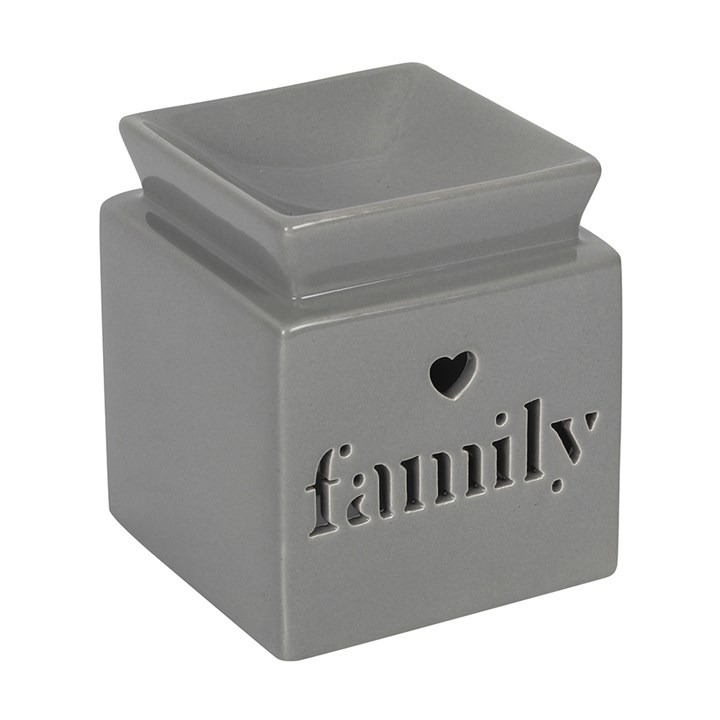 This light grey ceramic oil burner and wax warmer features a cutout heart and ‘family’ text in a cute, contemporary design. Place fragrance oil or wax melts into the built-in dish with a standard tealight inside to fill the home with calming fragrance. Product Dimensions: H11.5cm x W10cm x D10cm Packaged Dimensions: H15cm x W14cm x D14cm