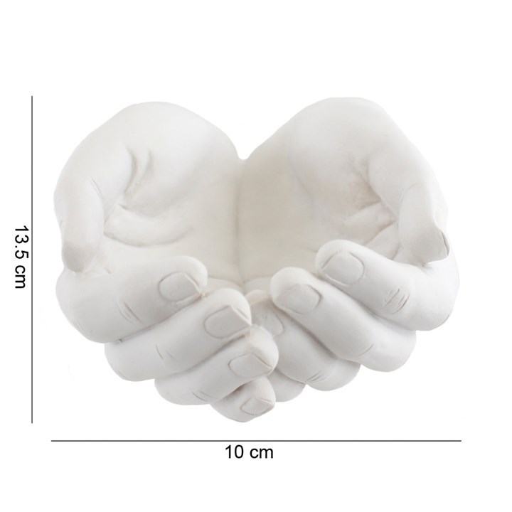Ornamental white plaster healing hands, ideal for displaying a small amount of crystal tumble stones. Flat base to stand neatly. Product Dimensions: H5.5cm x W10.5cm x D13.5cm Packaged Dimensions: H15cm x W12cm x D6.5cm