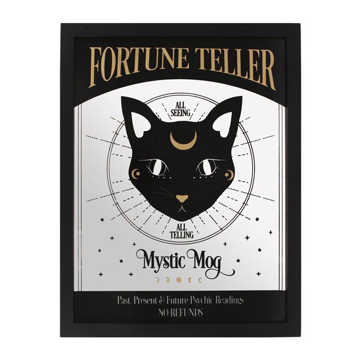 Entice your customers with this mystical mirrored wall hanging. A mysterious black cat beckons you with fortune teller text that reads, ‘All seeing, all telling. Mystic Mog. Past, present & future psychic readings. No refunds.’ 2 sawtooth hangers on reverse. Product Dimensions: H45cm x W35cm x D1.7cm Packaged Dimensions: H46cm x W36cm x D2cm