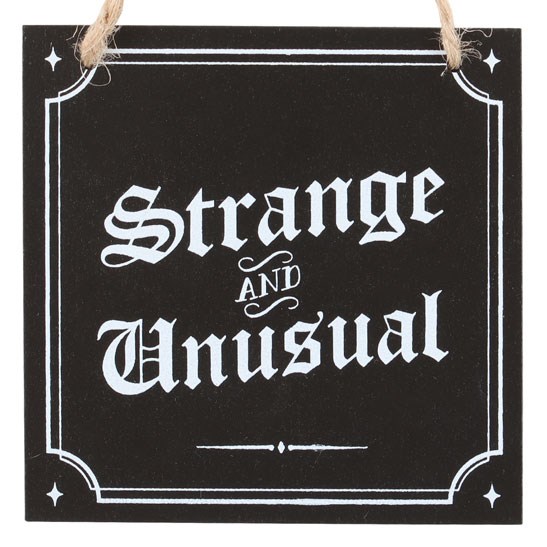 Summon a smile with this delightfully peculiar hanging sign. Features ‘Strange and Unusual’ text written in gothic lettering that’s perfect for showing off your dark side. Finished with a jute rope for easy hanging.