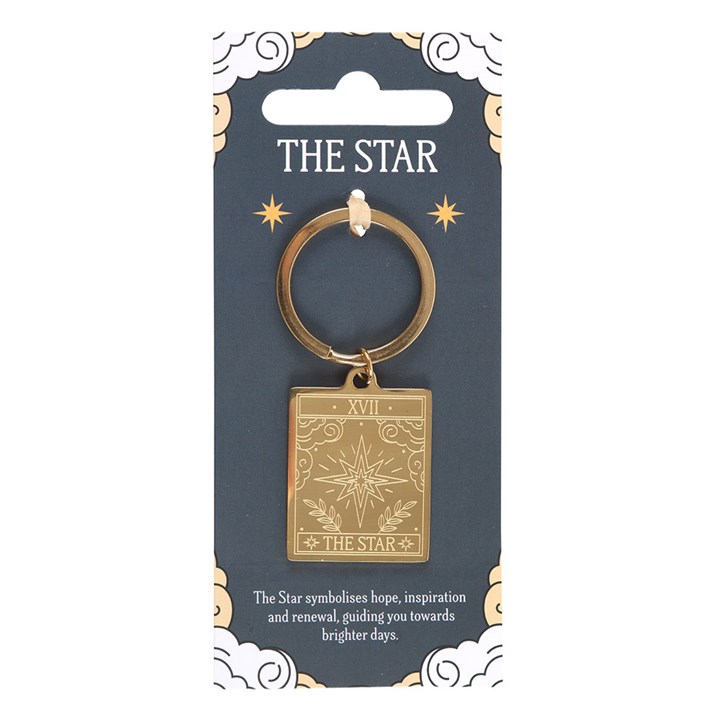 This gold-tone keyring featuring a traditional The Star tarot card design will make a magical and stylish addition to any set of keys or bag. Presented on a matching backing card for easy gifting.